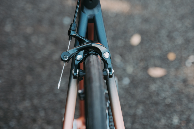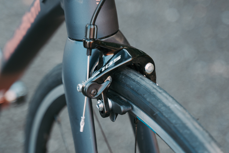 「いまさらリムブレーキ?」という人もいるでしょう。しかし、この価格帯でディスクブレーキ仕様にしようとすると、犠牲になる点がたくさん出てきます(快適性、ホイールの重さ、機械式ブレーキキャリパーの引きの重さと制動力不足など)。