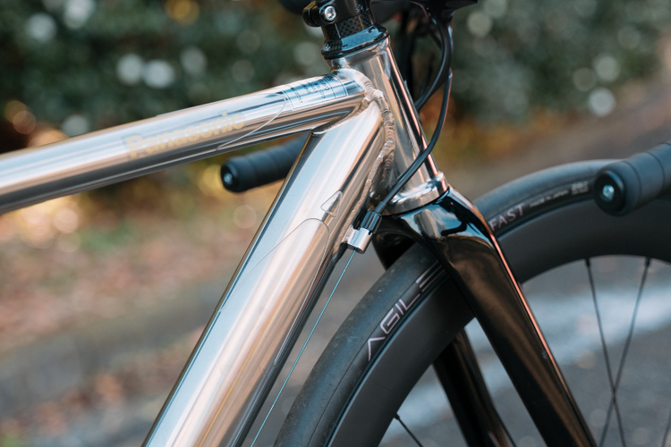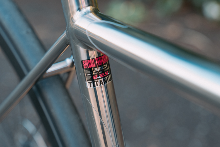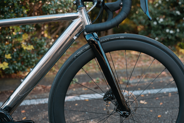 走りはチタンフレームの伝統に則ったもの。しなやかでばね感のある剛性感。振動の減衰が速い優しい乗り味。疲れにくくスムーズなペダリングフィール。試乗したのはバージョンHでしたが、高剛性版とはいえガチガチではなくてペダルが回しやすい。チタンらしいオーガニックな感じと、肉薄チューブらしいパリッと感の絶妙なバランス。ディスクブレーキになって剛性は上がりましたが、チタンらしさは健在です。
