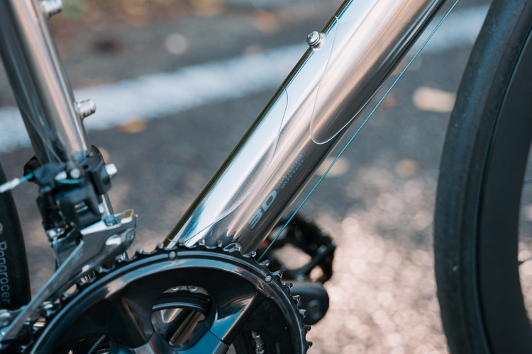 そんなパナソニックが数年間という開発期間を経て発表したフラッグシップ機がこのFRTD05。ものを見ると、まあ手がかかってます。ダウンチューブとシートチューブには複雑なバテッド加工(3Dオプティマム・Xバテッド)が施されており、ただのチタンフレームではないことを主張します。そこいらの工場ではこんな加工は不可能です。
