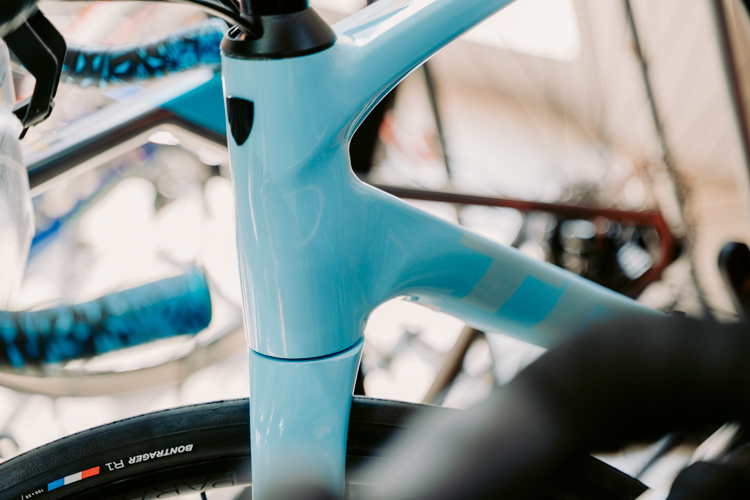 このRLシリーズは、ロングライド向きのラインナップで、長距離での疲労蓄積を抑える設計が特徴。コラムまでフルカーボンのフォークが路面の衝撃を和らげます。