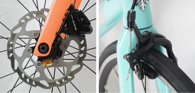 ホイール中心の円盤(ディスクローター)をキャリパーで挟み込んで制動するディスクブレーキ(左)。ホイール外周のリムを挟んで止めるリムブレーキ(右)と比べ、制動面が水や汚れの影響を受けにくく、雨天時でも安定した制動力を得やすい