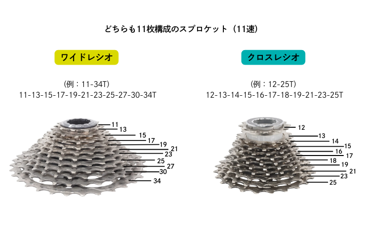 スプロケットの数字(歯数)を見るとき、もう一つ知っておきたい重要なキーワードがあります。それが「ワイドレシオ」と「クロスレシオ」です。