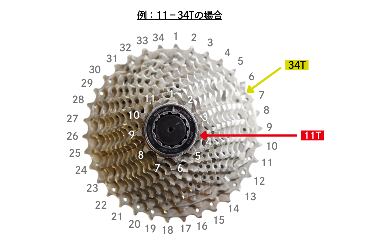 ロードバイクのスペック表のスプロケットの欄には「11-34T」といった数字が必ず記載されています。これは、以下のようなことを意味しています。