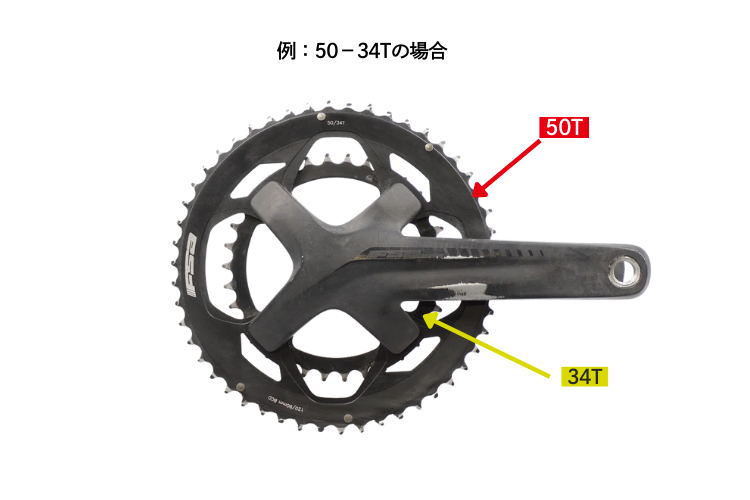 ここでも「50-34T」のような数字が出てきます。ここまで読み進めた方なら、この数字の意味するところがなんとなく分かるはず。そう、歯の数を指している数字ですね。