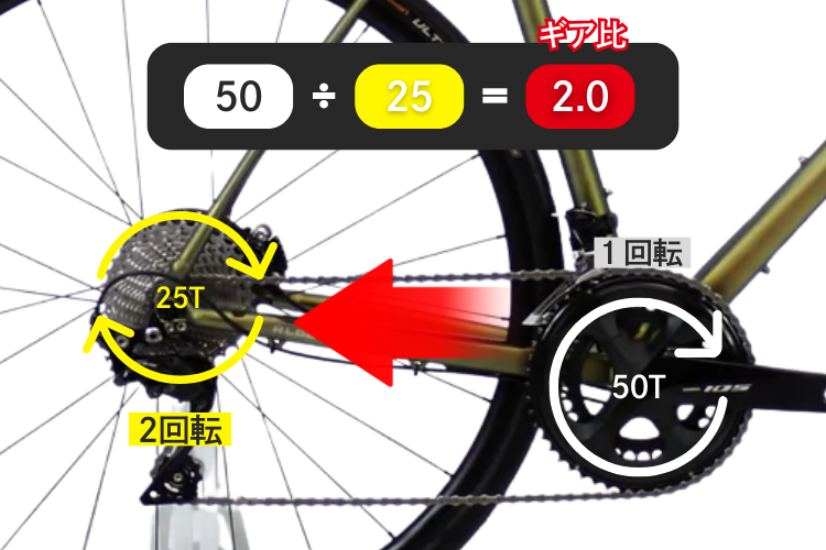 上記の場合、50 ÷ 25 = 2.0 です。 つまり、ペダルを1回転させると、リアホイールが2回転します。これがギア比2.0の状態です。
