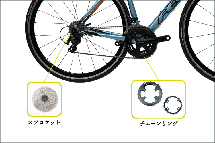 まず用語を整理すると、ペダルがつながっている前側のギアを「チェーンリング」、後輪の中心に付いているギアを「スプロケット」と呼びます。