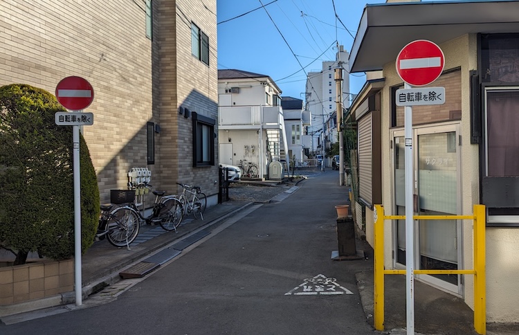家本  自転車に乗って左側通行で(一方通行出口の道に)入れるかなと思いきや、自転車の除外規定がない! 「車両進入禁止」の標識の下に、「自転車を除く」「軽車両を除く」っていうのが書いてない。