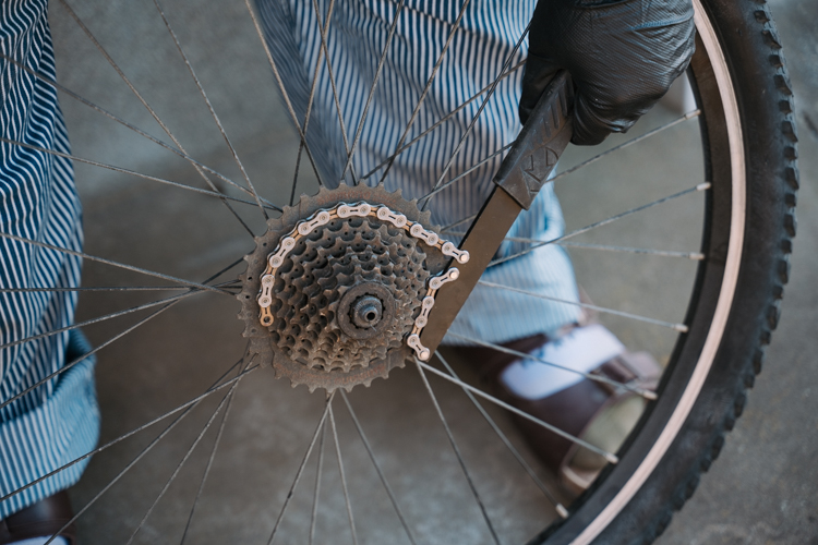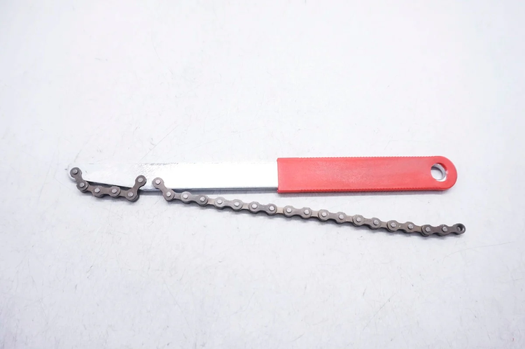 まずは左手を使って、フリーホイールチューナー(ナイフにチェーンがくっついたような工具)をスプロケットの歯にひっかけてセットします。どこの歯にひっかけても大丈夫ですが、大きめのギアにするのがおすすめ。