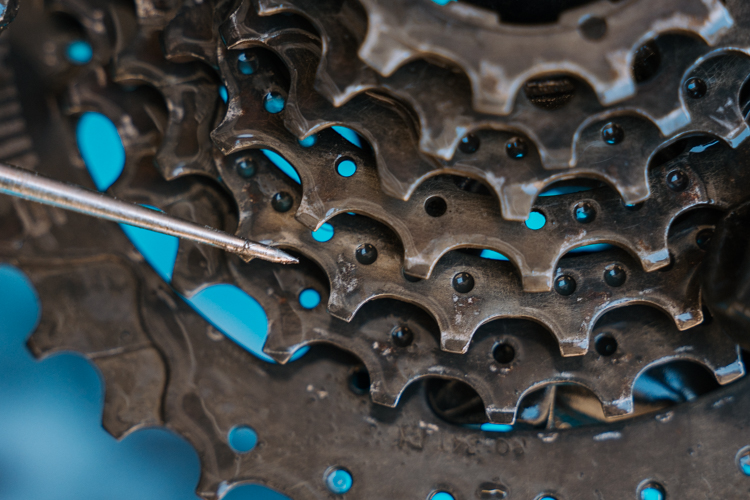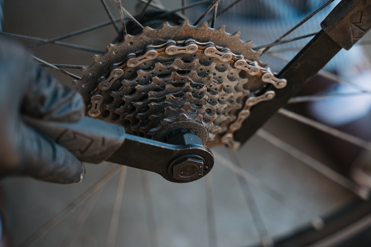 このとき、歯の隙間にたまった黒い汚れカスも取り除いておきましょう。スプロケを取り外さないと難しい作業なので、一緒にやってしまうのがおすすめ。先の細い工具でこそげ取るイメージです。