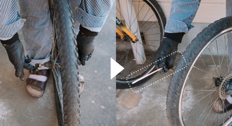 スプロケットが外側にくるようにして、ホイールを自分の両足の前に置きます。