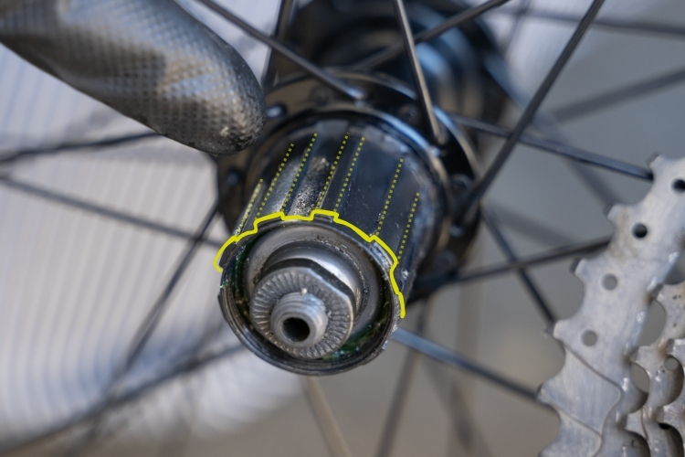 フリーボディにはスプラインと呼ばれる溝があり、この形状がスプロケット側と一致するようになっているので、位置を合わせて戻していきます。