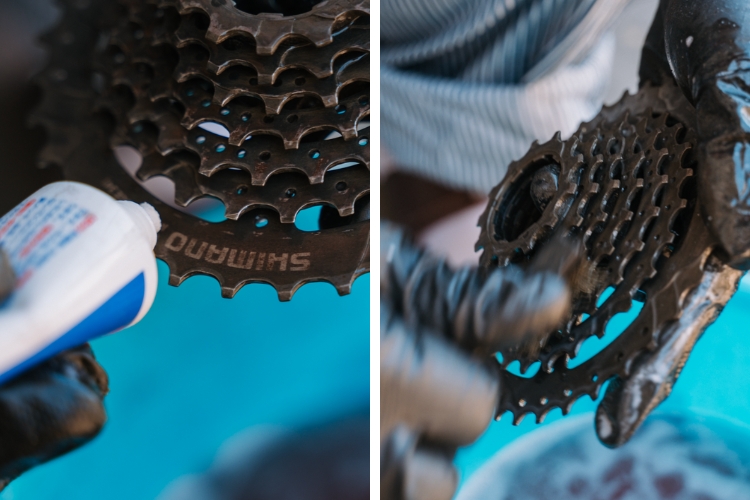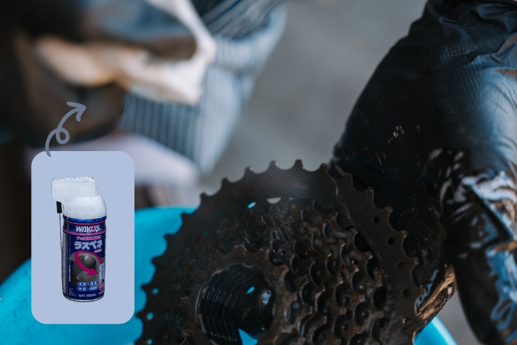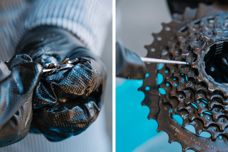 このとき、歯の隙間にたまった黒い汚れカスも取り除いておきましょう。スプロケを取り外さないと難しい作業なので、一緒にやってしまうのがおすすめ。先の細い工具でこそげ取るイメージです。